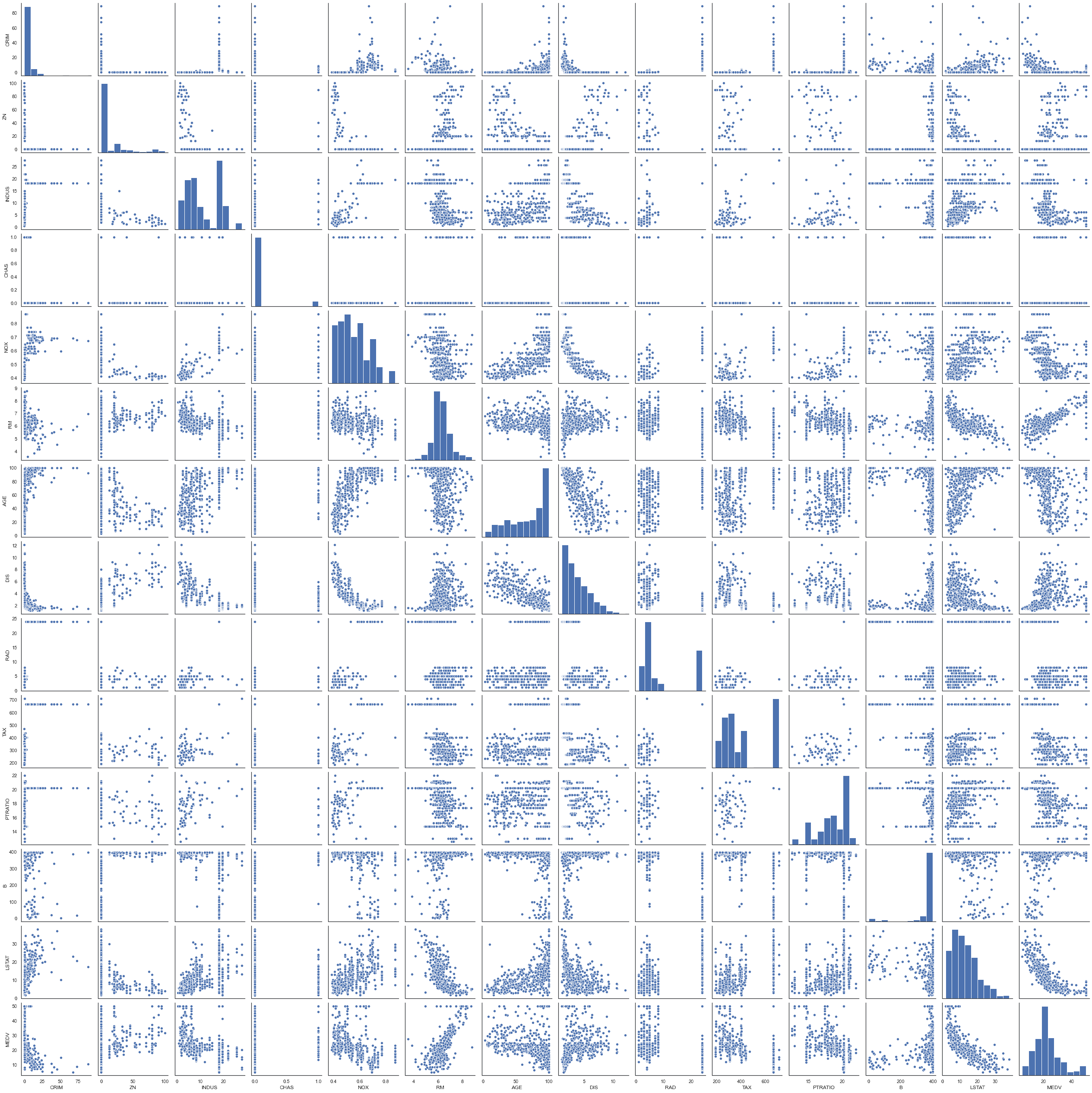 #sns.pairplot(df, x_vars=['CRIM', 'ZN', 'INDUS', 'CHAS', 'NOX', 'RM', 'AGE', 'DIS', 'RAD', 'TAX',