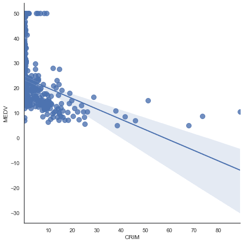 # 'PTRATIO', 'B', 'LSTAT'], y_vars='MEDV', size=7, aspect=0.7, kind='reg')Regression Evaluation Metrics